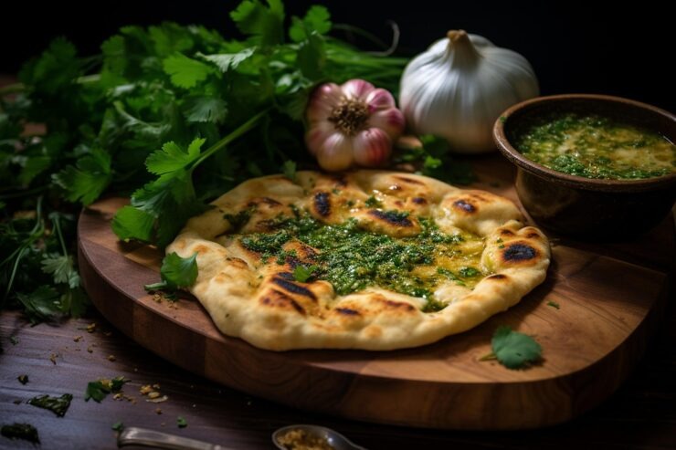Tandoori naan brushed with fresh garlic and coriander.