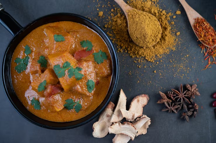 Boneless meat or chicken cooked with fresh tomatoes in a sauce with pomegranate, paprika and mango chutney.