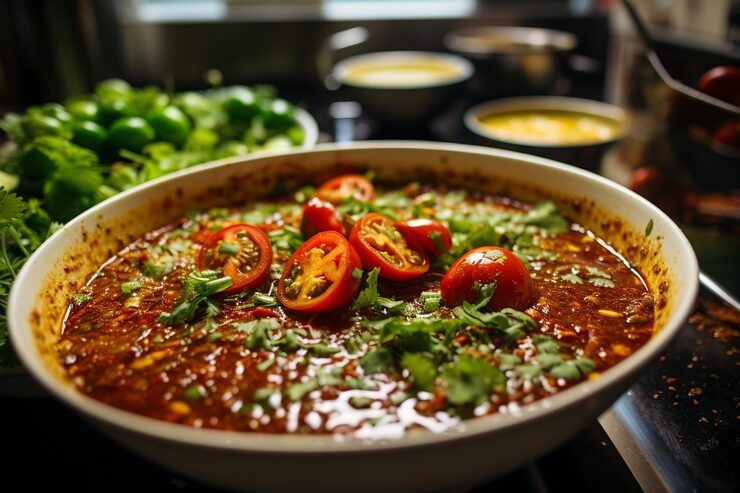 Boneless meat or chicken cooked in a strong Goan sauce based on a traditional South Indian recipe with burnt sugar, palm vinegar, cloves and warm spices. Very spicy. Served with basmati rice.